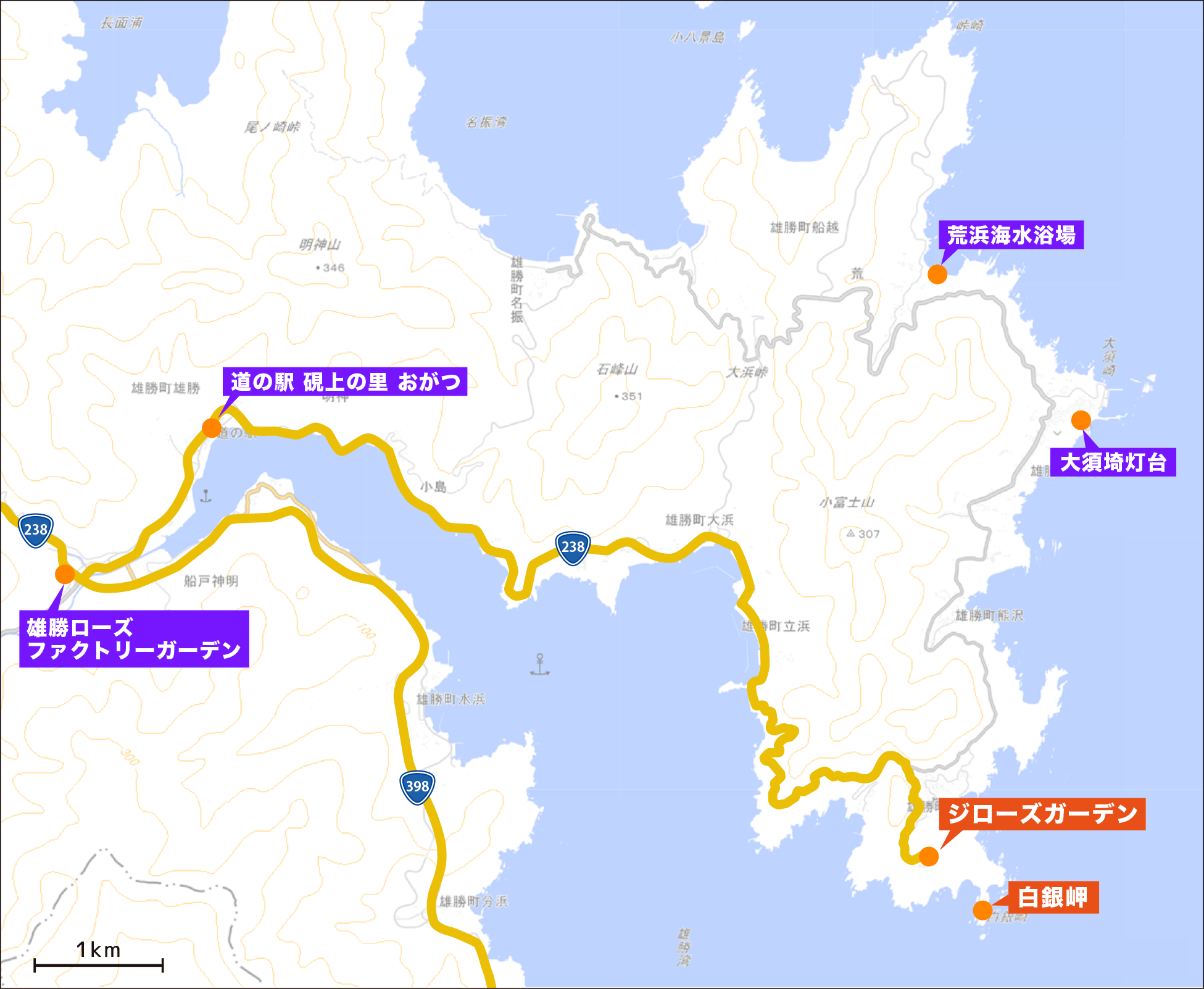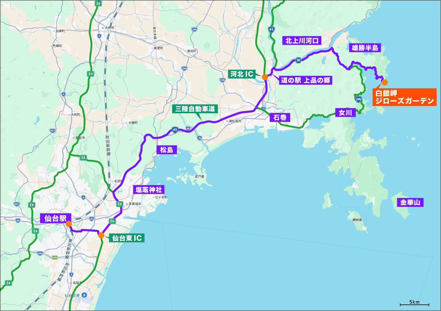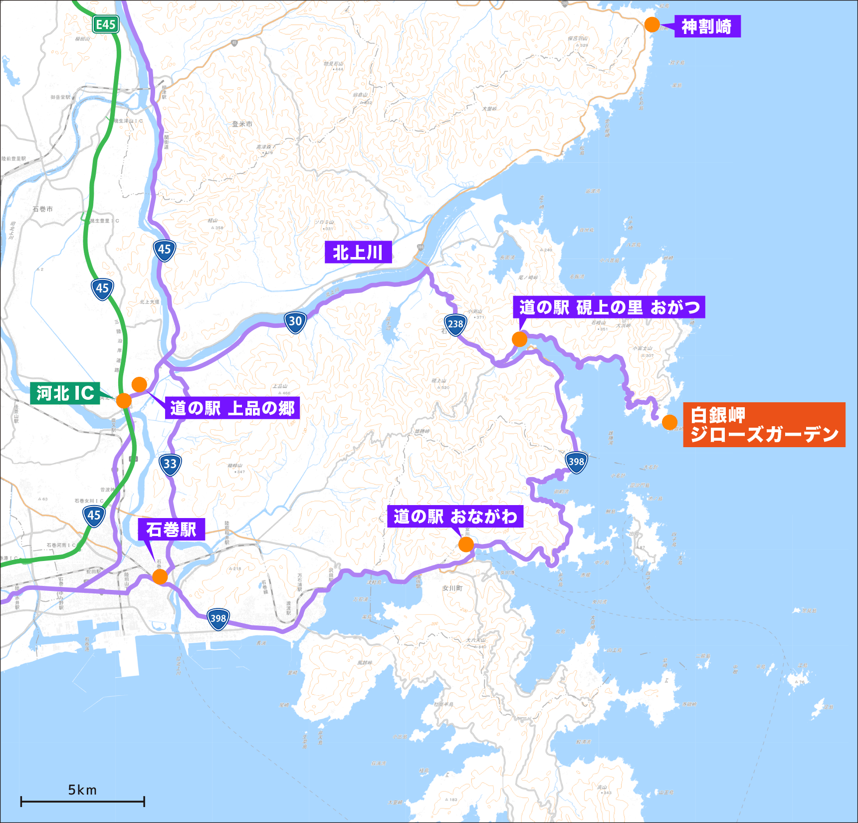 石巻駅から38.2km、県道33号→30号→238号を経由して、車で54分です。