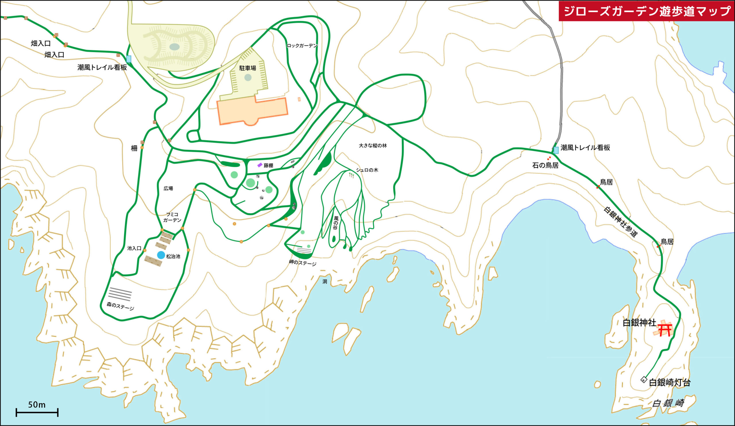 ガーデン内に散策できる遊歩道(下図の緑の線)が複数あります。